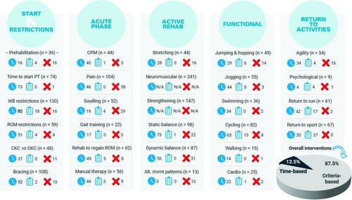 Figure 2. Nombre d’études contribuant à chaque domaine des programmes de rééducation postopératoire du LCA, avec la répartition des études par domaine selon qu’elles proposent des interventions basées sur le temps, des interventions basées sur des critères ou aucune intervention basée sur le temps et/ou des critères.